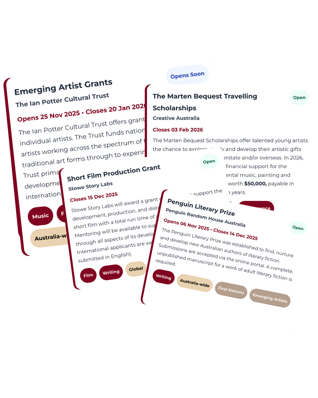 ✓⃝ Grants & Funding: The Artist Toolkit is a live, searchable database of Australian grants & residencies, that is regularly updated with the latest opportunities.